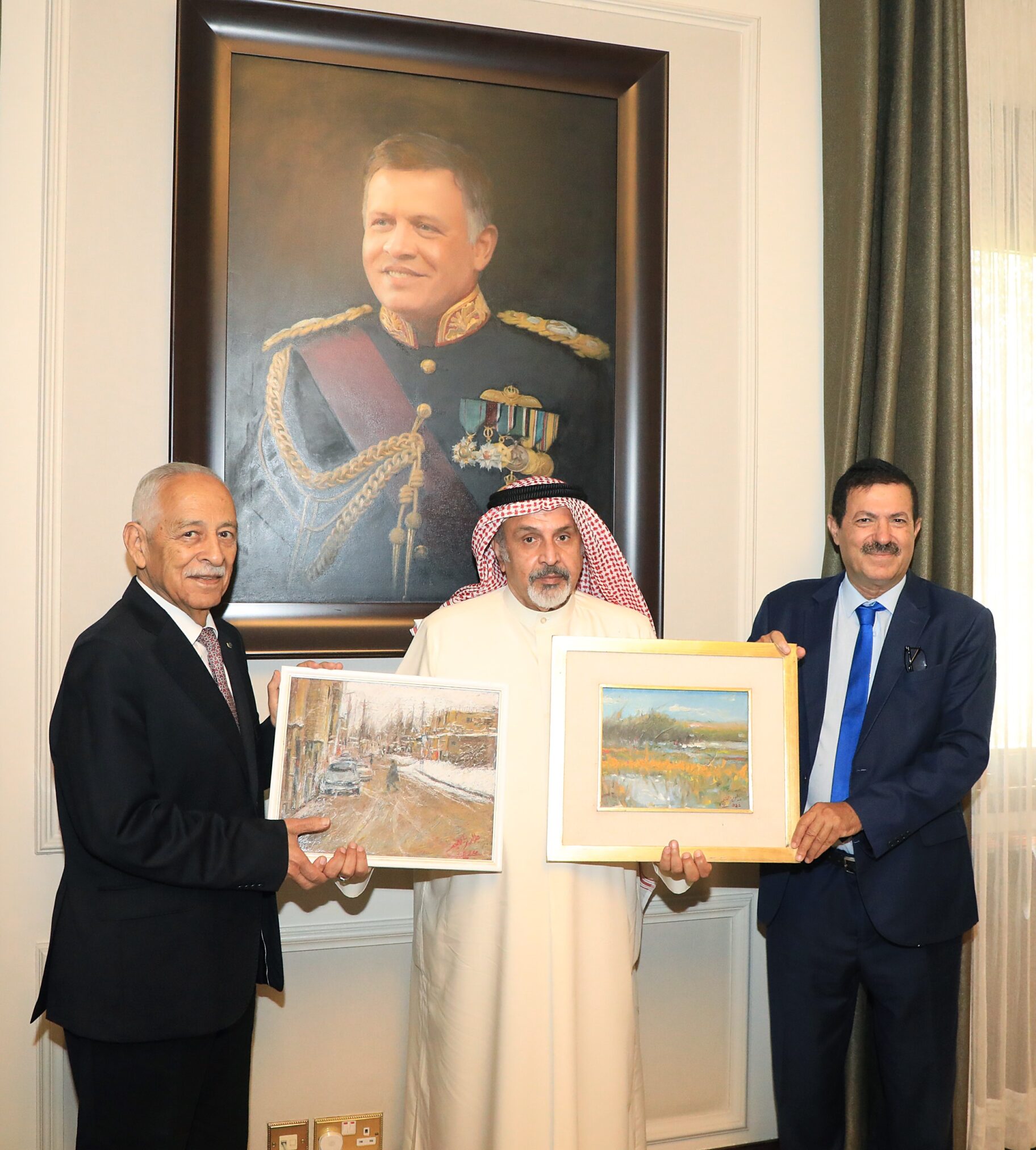 قدّم الفنان التشكيلي والكاتب الكويتي عبد العزيز التميمي لوحتين من رسوماته هدية الى جلالة ملك الأردن، تسلمها رئيس الديوان الملكي الهاشمي يوسف حسن العيسوي، في مكتبه خلال استقباله للفنان الكويتي، الذي يُشارك الآن بفعاليات مهرجان جرش بحضور المؤرخ عمر العرموطي/ مُعِد ومؤلف موسوعة عمَّان أيّام زمان.
